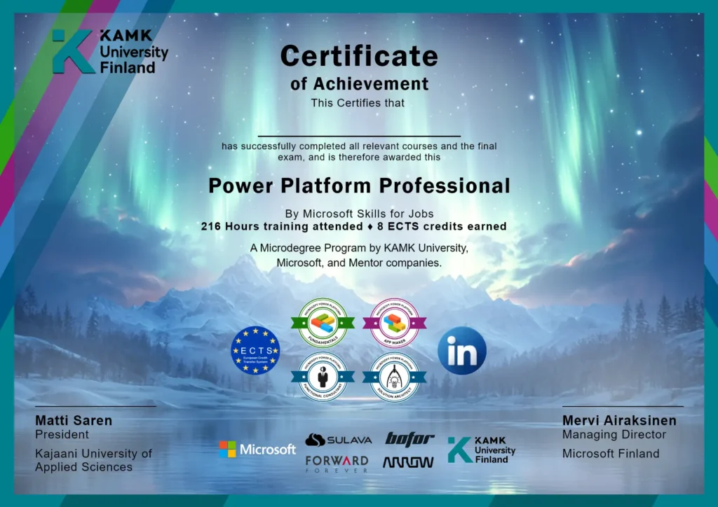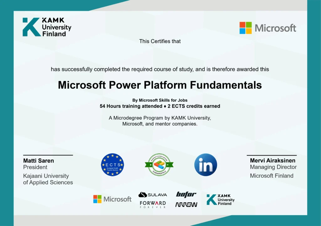 Microsoft Power Platform is a suite of professional-grade tools and services that enable users to automate processes, analyze data, and build applications for endless use cases. With its inspiring no-code approach, the platform is available for everyone regardless of their professional background. In this study program, consisting of four courses co-developed with Microsoft and mentor companies, we’ll cover all the basics of Microsoft Power Platform, its capabilities, and practical use cases. You’ll learn to build your own applications, get the most out of your data, and improve your work by automating workflows – with no programming skills required.
